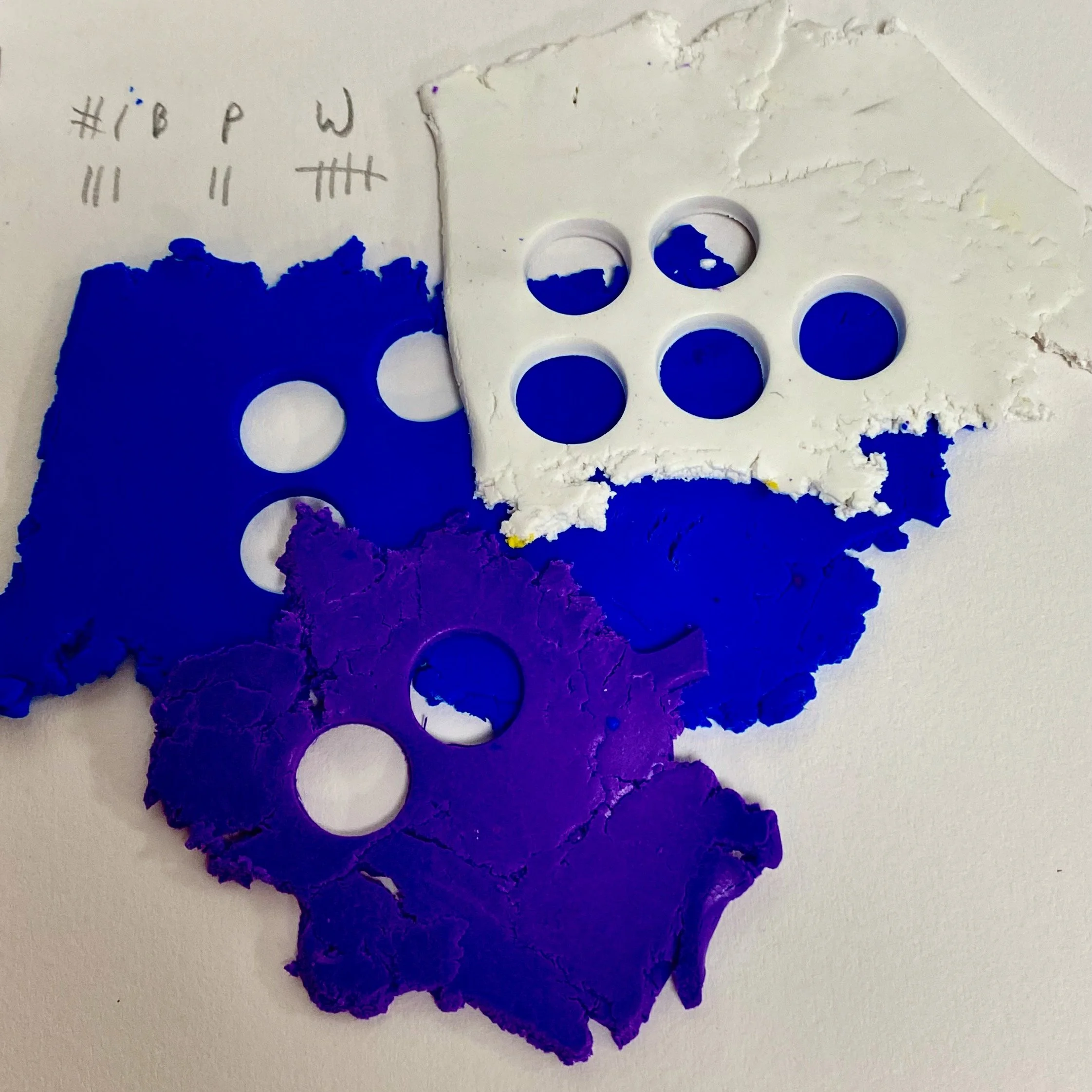This is an important bit!!!! I keep the sheet with all the empty holes as this helps me keep track of what I have used. If I need more, I DO NOT JUST RE-SHEET THE LEFT OVER COLOUR!!! I cut and condition more; and sheet that to keep track of numbers. AND I write things down on the way. I make a note of what thickness I have used in case I forget. Because sometimes I do and that would mean my parts were different!! You may have a much younger, sharper brain and not need to do this but can I just say, it is VERY easy to forget when you are adding a few colours at a time or taking a long time to gradually change a colour. Just saying. This photo shows what mixing my Blue-Purple Tint looked like! It was a good visual reminder that I used 3 parts of blue, 2 parts of purple and 5 parts of white!!